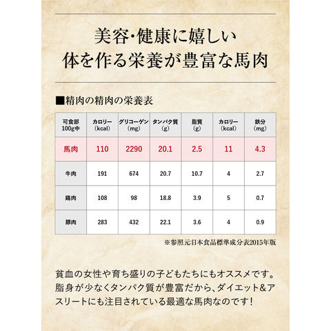 ≪桜うまトロ個食パック≫ 【桜うまトロ】馬肉(フランス産)、馬脂(フランス産) 【ソース】しょうゆ(国内製造)、赤ワイン、還元水飴、食用植物油脂、みりん、おろししょうが、乾燥玉ねぎ、おろし玉ねぎ、砂糖、醸造酢、コンソメ、食塩、オイスターエキス/酒精、調味料(アミノ酸等)、セルロース、酸味料、増粘剤(加工デンプン、キサンタン)、V.B1、香料、カラメル色素、カロテン色素(一部に小麦・乳成分・牛肉・大豆・鶏肉・ゼラチンを含む) ≪ユッケ個食パック≫ 【馬刺し】馬肉(カナダ産) 【ユッケのタレ】ぶどう糖果糖液糖(国内製造)、植物油、コチジャン調味料、味噌、醸造酢、食塩、香辛料/カラメル色素、増粘剤(キサンタン)、(一部に小麦・ごま・大豆を含む) ≪赤身スライス個食パック≫ 【馬刺し】馬肉(カナダ産) 【タレ】醤油(国内製造)、植物性蛋白加水分解物、糖類(砂糖、砂糖混合異性化液糖)、食塩、鰹節エキス/カラメル色素、調味料(アミノ酸等)、甘味料(カンゾウ、ステビア)、(一部に小麦・さば・大豆を含む) |