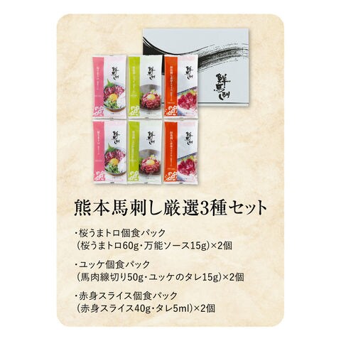 熊本馬刺し厳選3種セット(桜うまトロ個食パック、ユッケ個食パック、赤身スライス個食パック×各2セット) / 福さ屋 明太子 辛子明太子 おつまみ 晩酌 福岡 博多 土産 ギフト 贈り物 父の日 お中元 2025 冬ギフト 御中元 お歳暮 【公式ストア】