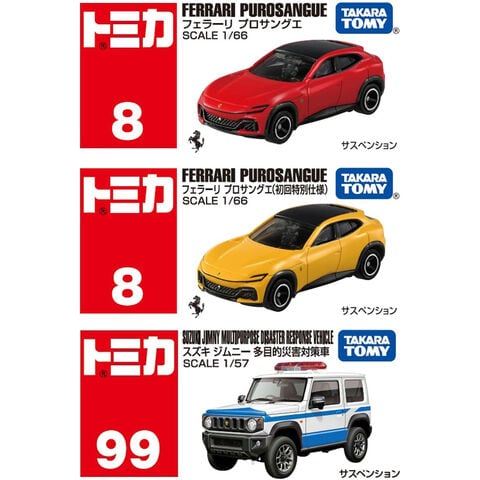 【送料無料!】トミカ 3点セット (No.8 フェラーリ プロサングエ 初回版&通常版 + No.99 スズキ ジムニー 多目的災害対策車) 【初回限定カラー 初回限定版 ミニカー 本体】