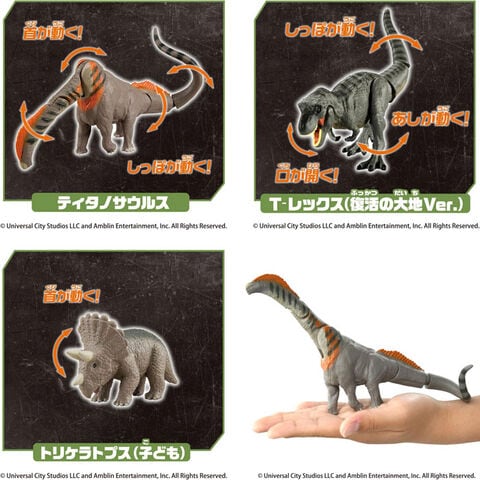 ティタノサウルス、T-レックス(復活の大地Ver.)、トリケラトプス(子ども)の3体セットです。