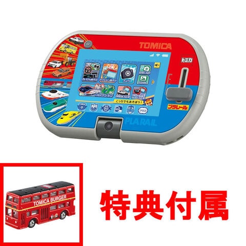あそび・まなびをアクティブに!トミカ・プラレールパッド 【トミカパット pad タブレット型知育玩具 ゲーム 勉強 学習 アプリ トイパッド】 ★購入特典 「トミカ ロンドンバス(パーティ仕様) (非売品)」 付属★ アクティブな操作で、トミカ・プラレールと遊んで学べる! 遊んで学べるアプリがたくさん!全61種!99アプリ! 持っているトミカ・プラレールと画面が連動!カメラで撮影したトミカ・プラレールが画面の中に登場するよ!(※トミカ(ミニカー)、プラレール(車両、レール)は別売りです。) トミカ・プラレールが登場する学習アプリがたくさん!【プログラミング】【いろとかたち】【ことば】【かず】【チャレンジクイズ】に挑戦! アプリをクリアしてスタンプをためよう!たまったスタンプで「トミカカード」「プラレールカード」「じょうけいカード」がもらえるよ!全100種以上! 【セット内容】 本体(1)、USBケーブル(タイプA-タイプminiB)(1)、取扱説明書(1) ■電池 : その他リチウムポリマー電池×1(内蔵)、充電用USBコード ※別売りのタカラトミー専用ACアダプターTYPE5Uを使用しても遊ぶことができます。 ■対象年齢 : 3歳以上 【JANコード】 4904810903598 ■メーカー:タカラトミー |