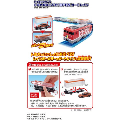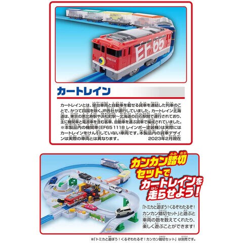 プラレール いっぱいつなごう トミカをはこぶぞ! EF65 カートレイン (6両編成) 【車両単品(編成車両) 電車本体 玩具 おもちゃ 誕生日 プレゼント】 ★購入特典 「トミカ ハンバーガーショップトレーラー (非売品)」 付属★ トミカといっしょに遊べる!レインボーカラーのカートレインがプラレールに登場! カートレインは寝台車両と自動車を載せる貨車を連結した列車の事で、主に機関車と電源車を含む客車、自動車を運ぶ貨車で編成されていました。 ●「EF65 1118 レインボー塗装機」がモデル ●6両編成でそれぞれ連結・切り離し可能 ●1スピードで電動走行、スイッチOFFで手転がし遊びが可能 ●貨車にはそれぞれ別売のトミカを搭載可能貨車1台につきトミカ1台を搭載可能、最大4台といっしょに遊べます。 ●客車は別売のプラキッズで乗車遊びが可能 ※商品画像内のトミカ(ミニカー)、レールは付属しません。 ■対象年齢 3歳以上 ■電池 単3×1本(別売) 【JANコード】 4904810912408 ■メーカー:タカラトミー |