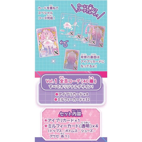 背景カードのアイプリカードは、2種類のアミューズメントゲーム「ひみつのアイプリ」「アイプリバース」で遊べる!ミルフィーカードは「アイプリバース」でアイテムごとに読みこんで遊べる!8パック入り1BOX。カードは全40種で全6キャラ登場。