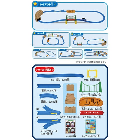直線レール(2)、曲線レール(12)、ターンアウトレール(L)(1)、ターンアウトレール(R)(1)、ぐらぐらレール(1)、ニュー坂レール(2)、丸太わたりレール(1)、ブロック橋脚(2)、レンガトンネルセット(4)、スタンド式つり橋(2)、シール(1)、レイアウトガイド(1)