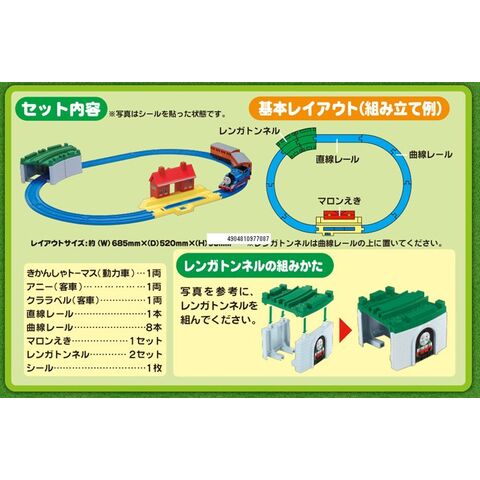 プラレール きかんしゃトーマス ベーシックセット (2018年発売版) 【車両本体 レールセット 機関車 電車 鉄道 タカラトミー 誕生日 3才】 ★購入特典 : 「トーマスのともだちステッカー(非売品)」 付属★ プラレールトーマスをはじめるお子様におすすめ! トーマス(動力車)とアニー&クララベル(貨車)、マロン駅とレンガトンネル2個にレールが付いた、トーマスの世界観が楽しめるセットです。 レンガトンネルに別売レールを組合わせれば、立体交差レイアウトも楽しむことができます。 【セット内容】 トーマス(動力車)、アニー(2両目)、クララベル(3両目)、マロン駅、レンガトンネル×2、直線レール、曲線レール×8、シール、部品注文書 ■対象年齢 3歳以上 ■電池 単3×1本(別売) 【JANコード】 4904810977087 ■メーカー:タカラトミー |