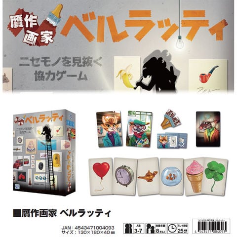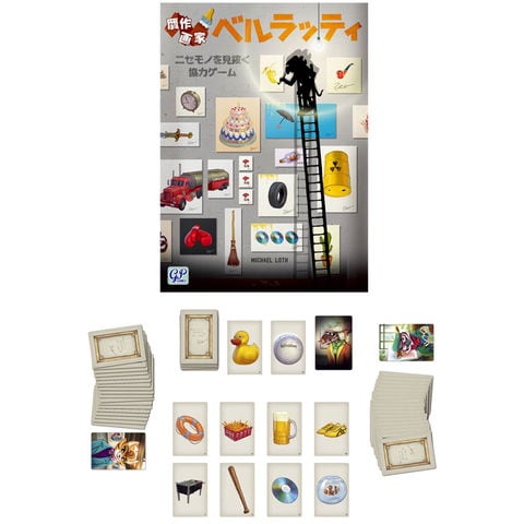 贋作画家 ベルラッティ (Belratti) 日本語版 カードゲーム ボードゲーム 【グッズ 雑貨 誕生日 クリスマス プレゼント ギフト 玩具 おもちゃ】 ニセモノを見抜く協力ゲーム! 2018年ドイツ・エッセンシュピールで人気投票1位になった話題作! 画家役が出した絵を、館長役が選ぶという単純なルールですが、紛れ込んだ贋作にみんな騙されちゃう!?お互いの感性の違いが面白い協力ゲーム! 【遊び方】 まずは、画家役と館長役の2つのチームに分かれます。お題から連想する絵画を、画家たちの手札から出します。そして、山札の上から4枚の絵画カード(ベルラッティの贋作)を加えてシャッフル。その後に、館長が鑑定を行い、正しい絵を当てるというシンプルな協力ゲーム。ベルラッティのニセモノが6点を選んでしまう前に一定の枚数本物を見抜けば勝ちとなります。 【ポイント】 お題にぴったりな絵画カードが無いことがあります。なので、ピッタリすぎる場合は贋作を疑いましょう。画家役がどういう連想でその絵を選んだかを推測しながら選ぶことが楽しいゲームです。 (1)例えば、お題「黄色いアヒル」で、出されたカードは「浮き輪」「フライドポテト」「ビール」などがありました。“パパはビール好きだから、黄色でビールを出したよ!”。※贋作は「フライドポテト」でした。 (2)例えば、お題「バーレーボール」で、出されたカードは「CD」「バット」「スニーカー」などがありました。“(画家役の)彼女は大谷選手大好きだから、きっとバット出したよ!”。“きっと丸いものでCD出したんじゃない?”。※贋作は「スニーカー」でした。 【セット内容】 カード、タイル、説明書 ■対象年齢:8歳以上 ■プレイ人数:3-7人 ■プレイ時間:25分 ■メーカー:ジーピー (GP) |