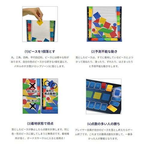 ドロップイット新版 ボードゲーム ジーピー 【日本語説明書付属 日本語箱 対戦パズルゲーム パーティーゲーム 落ち物 プレゼント ギフト 玩具】 見た目がおもしろい、落としていく人気パズルゲームがリニューアルして登場!。 アメリカで良質な玩具を選ぶガイドとして認知されているペアレンツチョイス(2018銀賞)も受賞しています。 パネルの間に様々な形のピースを落とし込んで得点を重ねていくシンプルなルール。 でも、予測不能なピースの動きに要注意! 跳ねたり、滑ったり、ずれたり。同じ色や形のピースに接してしまうと0点に! 思いがけないタイルの動きを予想しながら、奇跡的なバランスで高得点を狙いましょう。 以前のバージョンにはない「協力」や「ソロプレイ」のルールが追加! 対戦とは違った達成感が味わえます。 ピースの動きに一喜一憂!? パネルの間に様々な形のピースを落とし込んで、得点を重ねていくアクションゲームです。 ただ、ピースの動きは予測できません! 跳ねたり、滑ったり、ずれたり、はさまったり……。 ここに着地するだろうと思っても、全く違う結果になってしまうことも。 思いがけないピースの動きに翻弄されながらも、奇跡的なバランスで着地させ、高得点を狙っていく。 簡単なルールながら、テクニックが必要な良作です。 【こんな方にオススメ】 ●簡単なルールで、かつ手ごたえのあるゲームを求めている方 ●パーティー等の用途で、すぐに遊べるゲームを探している方 ●お子さんやお孫さんと一緒に楽しめるゲームを探している方 ■プレイ人数:1-4人 ■年齢:8歳以上 ■時間:約30分 ■メーカー:ジーピー |