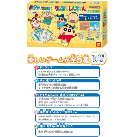 基本のドンジャラから、「クレヨンしんちゃん」ならではのゲームまで、2人から遊べるゲームを5種収録。