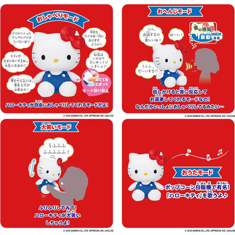 どんどんおしゃべりしてくれる「おしゃべりモード」、ユーザーの声や音に反応してお返事してくれる「おへんじモード」、振ると笑ってくれる「大笑いモード」、ポップコーン自販機で有名な『ハローキティ』を歌ってくれる「おうたモード」など、楽しい機能がいっぱい♪