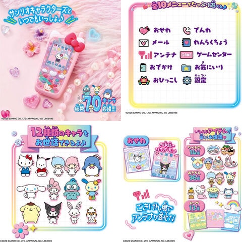 ずっと×2なかよしケータイ サンリオキャラクターズ HELLO KITTY Ver. (ハローキティ) 【携帯電話型 お世話 ゲーム 電話 アプリ 本体 プレゼント 玩具】 総勢70のサンリオキャラクターズが登場するガラケーモチーフの液晶アイテム! お世話遊びを中心に、電話、emojiメールでサンリオキャラクターズとコミュニケーション!! お世話キャラのご機嫌度UPでアンテナもバリ3に!ご機嫌度が下がると圏外になっちゃうよ。 ごはんをあげたり、お風呂に入れたり、お着替えをさせたり、たくさんお世話をしてあげてね。 かわいいお洋服、サンリオキャラクターズモチーフのごはんにおへやとお世話が楽しくなるアイテムももりだくさん♪ お誕生日にはスペシャルな電話とメールがきちゃうかも!? お世話できるキャラクターは、ハローキティやウサハナ、コロコロクリリンなど全部で12種類! お買い物をしたり、公園でお友達に会えたり、 サンリオピューロランドでアトラクションやパレードを楽しんだり、おでかけ先も充実。 全10メニューでミニゲーム4種も搭載。 本体デザインは、ハローキティ、シナモロール、クロミの3種類です(※ゲーム内容は3種共通)。 [使用電池]単4 × 3(別売) [対象年齢]6才以上 ■メーカー:バンダイ |