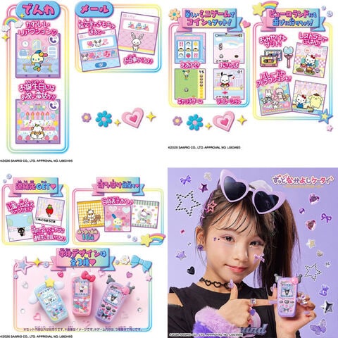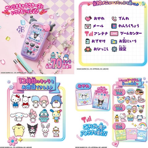 ずっと×2なかよしケータイ サンリオキャラクターズ KUROMI Ver. (クロミ) 【携帯電話型 お世話 ゲーム 電話 アプリ 本体 グッズ プレゼントギフト 玩具】 総勢70のサンリオキャラクターズが登場するガラケーモチーフの液晶アイテム! お世話遊びを中心に、電話、emojiメールでサンリオキャラクターズとコミュニケーション!! お世話キャラのご機嫌度UPでアンテナもバリ3に!ご機嫌度が下がると圏外になっちゃうよ。 ごはんをあげたり、お風呂に入れたり、お着替えをさせたり、たくさんお世話をしてあげてね。 かわいいお洋服、サンリオキャラクターズモチーフのごはんにおへやとお世話が楽しくなるアイテムももりだくさん♪ お誕生日にはスペシャルな電話とメールがきちゃうかも!? お世話できるキャラクターは、ハローキティやウサハナ、コロコロクリリンなど全部で12種類! お買い物をしたり、公園でお友達に会えたり、 サンリオピューロランドでアトラクションやパレードを楽しんだり、おでかけ先も充実。 全10メニューでミニゲーム4種も搭載。 本体デザインは、ハローキティ、シナモロール、クロミの3種類です(※ゲーム内容は3種共通)。 [使用電池]単4 × 3(別売) [対象年齢]6才以上 ■メーカー:バンダイ |
