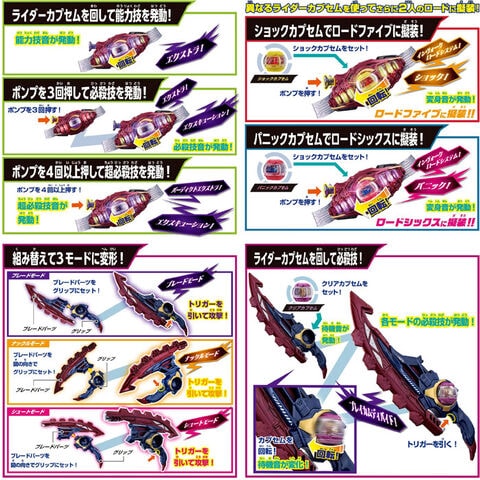 ロードスリー、ロードファイブ、ロードシックスへの擬装遊び、必殺技遊び、クリアカプセムのパワー解放遊びが楽しめます。