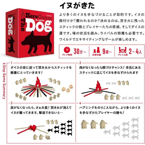 itten イヌがきた (Here Comes The Dog) ボードゲーム 【犬が来た いぬ 対戦ゲーム フィギュア 模型 おしゃれ インテリア 置物 プレゼント 玩具】 なぜ?イヌたちは近づいてくるのか? その昔、人とイヌが出会った頃のこと。焚き火を囲む人々のまわりには、“エサ”にありつこうとするイヌたちがウロついていた…。 『イヌがきた(Here Comes the Dog)』は、焚き火とイヌの群れの情景が印象的な2?4人用のアナログゲームです。イヌがまだ人と友達ではなかった頃、その出会いの瞬間がテーマになっています。 お互いの行く末は焚き火の炎だけが知っているのだとか。。 プレイヤーは焚き火にくべられた、炭、火、肉のスティックをダイスをふって順番に選びとっていきます。肉が先になくなればイヌを餌づけして手なずけられますが、炭が先になくなったら焚き火が消えて逆に襲われてしまいます。餌づけを目指すのか? あえて襲われるのか? 交錯する思惑のもと、スティックの交換と奪い合い、ダイスのゾロ目のハプニングをのりこえて、より多くのイヌを手なずけたプレイヤーが勝利します。 2nd Editionでは、よりスリリングな展開が楽しめるよう、少しルールが改訂されています。主な改訂項目は下記の通りです。 また、バリエーションルール「Dancing Villager」を新たに収録。村人コマをダイスにしてイヌと炎をとりあうアクションゲームです。 1st Editionのコンポーネントでも改訂ルールやバリエーションルールを遊んでいただけます。 <2nd EDITIONでの主なルール改訂箇所> ハプニングのダイス目がでた場合、ハプニング処理の後、同一プレイヤーが再度ダイスを振る。 倒れた村人を肉によって回復させることはできない。 村人が全員倒れた時、餌付けをしたイヌがすべて群れに戻り、村人は一人少ない状態で自動的に回復する。 ■ゲームデザイン Naotaka Shimamoto ■アートワーク Yoshiaki Tomioka ■プレイ人数 2~4名 ■プレイ時間 30分 ■対象年齢 9歳~ ■箱サイズ 140*140*55mm 【日本語 テーブルゲーム 対戦ゲーム フィギュア 模型 インテリア 置物 雑貨 誕生日 クリスマス プレゼント ギフト 玩具 おもちゃ】 ■メーカー:合同会社itten(イッテン) |