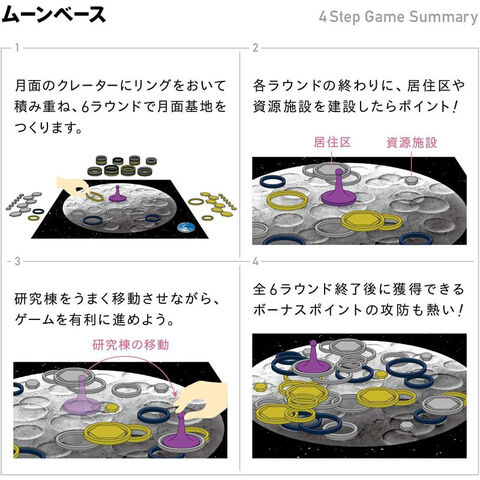 itten ムーンベース (Moon Base) ボードゲーム 【月面 日本語 対戦ゲーム フィギュア 模型 おしゃれ インテリア プレゼント ギフト 玩具 おもちゃ】 20xx年、月面にて。 20XX年。人類がアポロ計画のもと月面に降り立ってから半世紀以上の時をへて、ついに各国は協力体制を整え「ムーンベースプロジェクト」を始動させた。移動式研究棟と積層リングモジュールを活用した6カ年にわたる月面基地の構築開始を目前に、開発者たちはプロジェクトの主導権をかけて準備を開始する…。 このゲームは月面を舞台にした二人用のアブストラクト系ゲームです。6ラウンドで進行します。プレイヤーは、ラウンドごとに「リングモジュール」を補充し、クレーターに配置したり積み重ねたりしながらムーンベースを構築していきます。3色のリングをうまく使って自分の色が有利になるように進めていきます。各ラウンドの終わりに「居住区」「資源施設」を建設するとポイントになりますが、ときに「移動式研究棟」を効果的に動かしながら、6ラウンド終了時に獲得できるボーナスポイントも狙っていきます。最後に合計ポイントが多いプレイヤーが勝利します。 【MOON BASEの5つの特徴】 <特徴1>ユニークな月面ボード 月面ボードの印象的なクレーターがこのゲームのマス目です。クレーターは重なり合っているため、こちらにリングを置けばあちらの目が、あちらにリングを置おけばこちらの目がつぶれます。リングをどのクレーターに置くか、置かれるかによって、盤面の状況が変化しゲームプランに影響します。気になるクレーターは早い者勝ち! <特徴2>積み重ねる立体ゲーム ムーンベースを構築するリングモジュールは二段三段…と積み重ねていきますが、そのとき置く位置が後々の手番に影響をおよぼします。戦略的なゲームですが、アナログゲームならではのプレイ感がミックスされています。「このリング、もう少し内側に置いておけばよかった!」と楽しく後悔してください。 <特徴3>ランダムなセットアップ アブストラクトなゲームですが、リングモジュールの準備はランダムに行います。 でもゲームが始まってしまえば、自らの選択と決断だけが頼りです。全てのリングモジュールは開示されているので、どのリングを選び取るのか?次のラウンドを見通し相手の動きを読んで、ランダムを必然に変えてください。 <特徴4>終盤になるほど盛り上がる攻防 各プレイヤーは、4手×6ラウンド=計24手だけで競います。最終ラウンド後の状況によってボーナスポイントが獲得できるので、終盤になるほど攻防が熱くなります。逆転を決める意外な一手をみつけてください。 <特徴5>完成した月面基地に未来を想う ゲーム終了は同時にムーンベースが完成するとき。競争の末に出来上がったボード上の見事な光景は、ライバルとの共作です。夜空の月を眺め、やがてくる未来へ想いを。 ■ゲームデザイン Naotaka Shimamoto ■アートワーク Yoshiaki Tomioka ■プレイ人数 2名 ■プレイ時間 30分~ ■対象年齢 9歳~ ■箱サイズ 190*190*55mm 【日本語 テーブルゲーム 対戦ゲーム フィギュア 模型 インテリア 置物 雑貨 誕生日 クリスマス プレゼント ギフト 玩具 おもちゃ】 ■メーカー:合同会社itten(イッテン) |