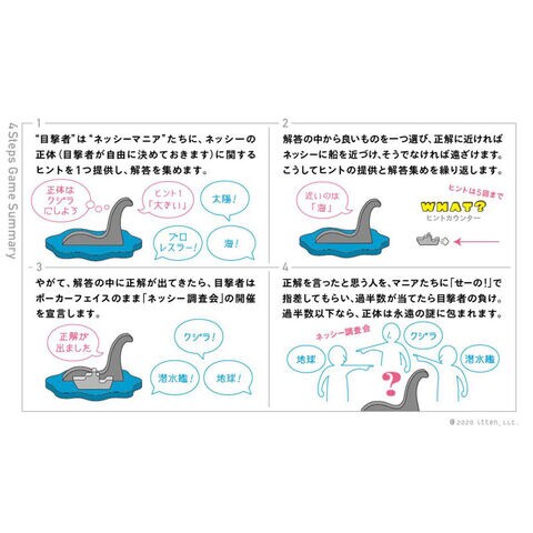 itten ネッシーの正体 (マッチ箱エディション)(Nessie's True Identity Small box Edition) ボードゲーム 【日本語 対戦ゲーム プレゼント ギフト 玩具】 もしかして、もしかすると?! ネッシーの正体は、誰もが知っている“あれ”だった…。あなたは、謎とロマンを愛するたった一人の目撃者。 知りたがりのマニアたちからネッシーの謎を守るため、巧妙なヒントを考えなくてはなりません。 「もしかして、もしかすると…」動きはじめるボート。 正体は突き止められるのか?永遠の謎に包まれるのか?ヒントと解答のシンプルなやり取りで楽しめる、コミュニケーション推理ゲームです。 ■ゲームデザイン Naotaka Shimamoto ■アートワーク Yoshiaki Tomioka ■プレイ人数 2人以上 ■プレイ時間 20分~ ■対象年齢 9歳~ 【日本語 テーブルゲーム 対戦ゲーム フィギュア 模型 インテリア 置物 雑貨 誕生日 クリスマス プレゼント ギフト 玩具 おもちゃ】 ■メーカー:合同会社itten(イッテン) |