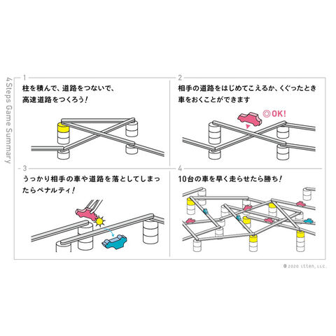 itten トーキョーハイウェイ 2人用 (Tokyo Highway 2P) ボードゲーム 【東京首都高速道路 建設 ミニカー 日本語、英語 対戦ゲーム フィギュア 模型 玩具】 このゲームは、複雑で特異なフォルムで世界に知られる東京首都高速道路をテーマにしています。 盤面やマス目はありません。柱を積んで道路を立体的に交差させながら、相手より先にすべての車コマを置き終えたら勝利です。 シンプルなルールにそって競い合ううち、机の上には不思議な空間ができあがります。 指先で巧に建設していくバランス感覚と、ダイナミックでユニークな設計戦略で、あなただけの道を作り上げてください。 組み合わせで最大6人プレイが可能に! 「2人用」と「レインボーシティ」を組み合わせることで、最大6人でプレイできます! ベーシックルールだけでなく、ビルやランドマークを絡めた建設のミッションをクリアして高得点を目指すミッションルールも遊べます。 ■ゲームデザイン Naotaka Shimamoto, Yoshiaki Tommioka ■アートワーク Yoshiaki Tomioka ■プレイ人数 2人 ■プレイ時間 30分~ ■対象年齢 8歳~ ■箱サイズ 245*122*50mm ■ルール説明書 日本語、英語 【東京首都高速道路 建設 ミニカー 日本語、英語 テーブルゲーム 対戦ゲーム フィギュア 模型 インテリア 置物 雑貨 誕生日 クリスマス プレゼント ギフト 玩具 おもちゃ】 ■メーカー:合同会社itten(イッテン) |