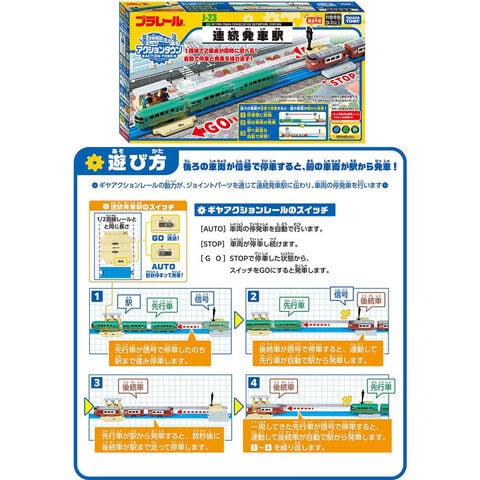 ※連続発車駅を機能させるために2編成のプラレール車両が必要になります。(車両は各3両以下で遊んでください。)