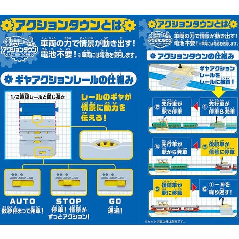 付属のギヤアクションレールは1/2直線レールサイズでレイアウトも組みやすい! キミだけの動き出す街を作ろう!