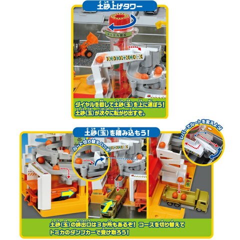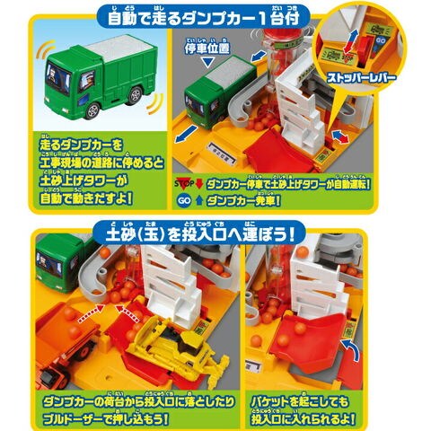 トラックの動力で土砂玉をくみ上げ、建設車両のトミカと遊べる工事現場です。