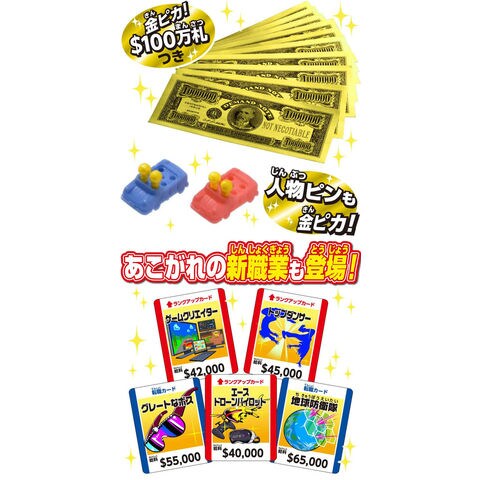 人生ゲーム ゴールデンドリーム 【ボードゲーム 金色 すごろく タカラトミー パーティゲーム 玩具 おもちゃ 誕生日 6才】 お宝ワクワク!人生ピカピカ! ゴールデンアイランドでお宝を集めて億万長者を目指そう! ●メインのゲーム盤から行き来できる立体コースの「ゴールデンアイランド」でお宝ゲットのチャンス! ゴールデンなお宝が描かれた「お宝カード」は全部で50種類! ●ゴールドに輝く特別な紙幣・金ピカ100万ドル札入り! さらに、ルーレットや建物、人物ピンなどがゴールドカラーで統一されているので、ゴージャスな気分で遊べちゃうかも!? ●ドローンパイロット・ゲームクリエイター・スケボー選手など、憧れの職業がシリーズ初登場! 【セット内容】 ルーレット付きゲーム盤(1)、ゴールデンアイランド台紙(別ボード)(1)、ゴールデンアイランド(1)、家(ゲーム盤についているもの以外で)(3)、自動車コマ 6色各1個(6)、人物ピン(ゴールド72本)(72)、職業カード・転職カード 1シート(16)、お宝カード 2シート(50)、お金(ドル紙幣)セット(保険証券付株券除く)(1)、お札立てトレー(1)、遊び方説明書(1) ■対象年齢:6歳以上 ■メーカー:タカラトミー |