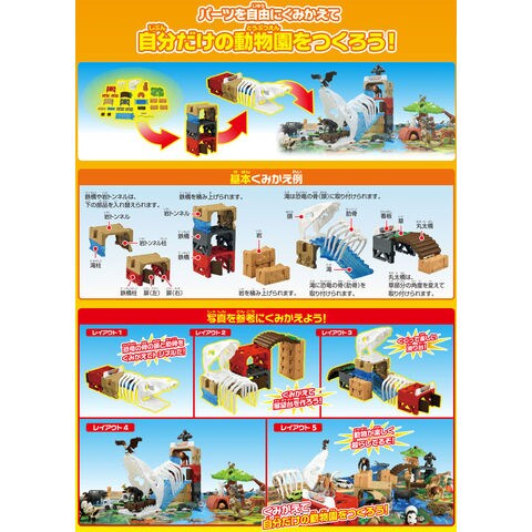 アニア 自由にくみかえ!サファリ動物園 (スペシャルトミカ同梱版) 【まちクリエイター対応 情景マップ レジャーシート 動物 どうぶつフィギュア 人形】 アニアで遊べるしかけがいっぱいの動物園が登場! パーツを自由にくみかえて自分だけの動物園を作ろう! リスザル、アミメキリン、ナイルワニ(ローラー付き)のアニアと、タイガーバスのトミカが付属しています。 口が開閉する恐竜の骨(頭)や、角度を変えて接続できる丸太橋など、見た目も楽しいパーツを自由にくみかえて、自分だけの動物園をつくれます。 くみたてた情景にアニアをのせたり、恐竜の骨(肋骨)のトンネルをくぐったり、滝の坂をすべらせて、水飛沫の上がる池に飛び込んだりして動物園ごっこができます。 対応するアニアは、ツタにぶら下げたり、恐竜の骨につかまらせて遊べます。 木にはツタをとりつけたり、木の葉を回転させることができます。 トロッコは、アニアをのせてプラレールに連結できます。 【セット内容】 滝(1)、池(1)、恐竜の骨(肋骨)(1)、恐竜の骨(頭)(1)、看板(1)、鉄橋(2)、扉(左・右)(1)、鉄橋柱(4)、岩トンネル(1)、岩トンネル柱(1)、滝柱(1)、ツタ(1)、丸太橋(1)、岩(4)、トロッコ(1)、切り株・幹・木の葉(1)、ナイルワニ(ローラー付き)(1)、アミメキリン(1)、リスザル(1)、マップ(900×600mm)(1)、スペシャルトミカ(タイガーバス)(1) ※セット内容以外のアニア(動物)、トミカ(ミニカー)は別売りです ※のせるアニアやレイアウトによっては、プラレールがうまく走行できない場合もあります。 ■対象年齢 : 3歳以上 ■メーカー:タカラトミー |