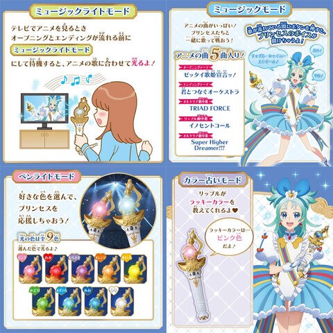プリンセッション・オーケストラ ミューズタクト 【武器 音楽 主題歌 オープニング エンディング 占い グッズ 雑貨 誕生日 クリスマス プレゼント 玩具】 アニメの曲がいっぱい!プリンセスたちと一緒に歌って戦おう! プリンセスたちが使う攻撃用アイテム。アニメの曲を5曲収録。 オープニング、エンディング、キャラソンとセリフが楽しめるミュージックモード、アニメの曲と連動して光り方が変わるミュージックライトモード、好きな色を選んでプリンセスを応援するペンライトモード、そして、色で占い遊びができるカラー占いモードがあります。 別売りのジール、ミーティアのジュエルベルに付け替えると、それぞれのキャラソンとセリフを聞くことができます。 【セット内容】 ミューズタクト本体(1)、ストラップ(1)、取扱説明書(1)、 ■電池 単4形アルカリ乾電池×3(別売) ■対象年齢 3歳以上 ■メーカー:タカラトミー(TAKARATOMY) |