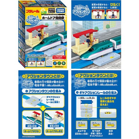 プラレール J-29 アクションタウン ホームドア開閉駅 【線路 情景部品 電車 鉄道玩具グッズ 雑貨 誕生日 クリスマス プレゼント ギフト 玩具 おもちゃ】 車両の力で情景が動き出す! アクションタウンのホームドア開閉駅が登場! 車両が駅に到着すると自動でホームドアが開く! 発車で閉まる! 付属のギヤアクションレールは1/2直線レールサイズでレイアウトも組みやすい! キミだけの動き出す街を作ろう! ギヤアクションレールはスイッチでAUTO、STOP、GOの3種類に切り替えができます。 AUTOでは車両が到着すると停車しホームドアが開きます。一定時間で車両は発車しホームドアが閉まります。 STOPでは停車したまま、ドアが開き続けます。(GOにすると発車し閉まります。) GOでは停車せず車両は通過します。 ■別売の「J-30 アクションタウン プラキッズ改札駅」とつなげることができ、車両が停車すると2つのアクションを一緒に遊べます。 ■ギヤアクションレールとホームドア開閉駅は別売のブロック橋脚に載せて遊ぶことができます。 ※ギヤアクションレール、ホームドア開閉駅の上にブロック橋脚を載せることはできません。 【セット内容】ホームドア開閉駅(1)、屋根(1)、ギヤアクションレール(1)、シール(1)、部品注文書(1) ■対象年齢 3歳以上 ■メーカー:タカラトミー(TAKARATOMY) |