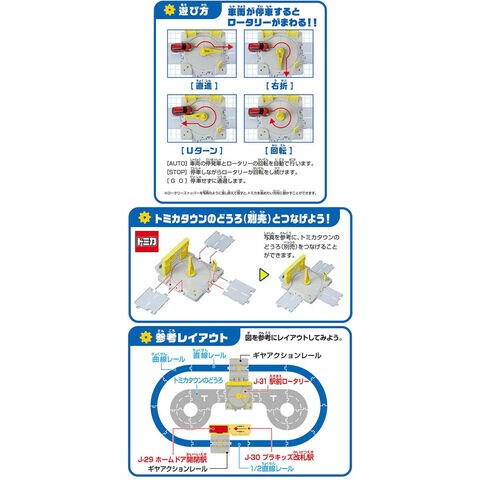 プラレール J-31 アクションタウン 駅前ロータリー 【線路 情景部品 電車 鉄道玩具グッズ 雑貨 誕生日 クリスマス プレゼント ギフト 玩具 おもちゃ】 車両の力で情景が動き出す! アクションタウンの駅前ロータリーが登場! 車両が駅に到着すると自動でロータリーとバス停看板がまわる! 付属のギヤアクションレールは1/2直線レールサイズでレイアウトも組みやすい! キミだけの動き出す街を作ろう! ギヤアクションレールはスイッチでAUTO、STOP、GOの3種類に切り替えができます。 AUTOでは車両が到着すると停車しロータリーとバス停看板が回転します。一定時間で車両は発車しロータリーとバス停看板も止まります。 STOPでは停車したままロータリーとバス停看板が回転をし続けます。(GOにすると発車し止まります。) GOでは停車せず車両は通過します。 ■ロータリーにはトミカを載せて遊ぶことができます。 ■トミカを載せて遊ぶ場合、ロータリーストッパーの向きを変えるとトミカの進行方向を変えて遊ぶことができます。 ■ロータリーはトミカタウンのどうろとつなげて遊ぶことができます。 ※トミカ(ミニカー)、トミカタウンのどうろは別売です。 【セット内容】ロータリー(1)、ロータリーストッパー(1)、駅舎(1)、バス停(1)、ギヤアクションレール(1)、シール(1)、部品注文書(1) ■対象年齢 3歳以上 ■メーカー:タカラトミー(TAKARATOMY) |