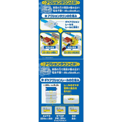 付属のギヤアクションレールは1/2直線レールサイズでレイアウトも組みやすい! キミだけの動き出す街を作ろう!