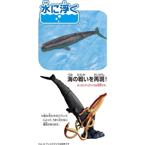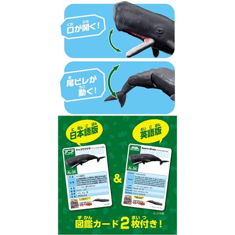 アニア AL-34 マッコウクジラ (水に浮くVer.) 【動物 恐竜 どうぶつフィギュア 人形 ミニチュア 玩具 おもちゃ 誕生日 プレゼント タカラトミー】 アニア ALシリーズに「マッコウクジラ」が登場! 潜水艦のような独特の姿が特徴の、マッコウクジラがアニアに登場。 口、尾ビレ(2か所)動きます。生き生きとしたポーズが再現可能です。 水に浮かせて遊ぶことができます。 ※ポージングや環境によって浮き方が変化する場合があります。 別売りの「AL-33 ダイオウイカ」と組み合わせれば、図鑑イラストなどでお馴染みの深海の戦いシーンも再現できます。 ※組み合わせのバランスによって、うまく立たない場合があります。 図鑑カード(日本語版、英語版)2枚付き。 ・「アニア」は、動かして遊べる手のひらサイズのギミック付動物フィギュアシリーズです。 ・「動物の特徴や種類を知りたい」という子どもの知的好奇心を刺激する「立体動物図鑑」として楽しめる商品です。 ・動かして遊べる可動ギミック、リアルな塗装&ディテール、遊びやすい手のひらサイズなどが魅力です。 【セット内容】 フィギュア(1)、スタンド(1)、図鑑カード(日本語版)(1)、図鑑カード(英語版)(1) ■メーカー推奨年齢 3歳以上 ■メーカー:タカラトミー(TAKARATOMY) |