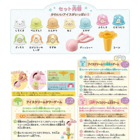 アイスクリームタワー すみっコぐらし バランスゲーム 【バランスゲーム パーティゲーム テーブルゲーム 模型 フィギュア おままごと コーン エポック社】 アイスクリームタワーシリーズに「すみっコぐらし」が登場! くずれないように注意しながら、ディッシャーを使って順番にコーンの上へアイスを積んでいく、ハラハラドキドキのバランスゲームです。 積んでいる途中でアイスをくずした人は負け! 遊び方もわかりやすく、みんなでワイワイ盛り上がる楽しいパーティーゲームです。 かわいいすみっコたちのアイス10個入り。楽しく積んで遊べます。 【セット内容】 ●アイス10種x1 「しろくま」「ぺんぎん?」「とんかつ」「ねこ」「とかげ」「ふろしき」「にせつむり」「ざっそう」「えびふらいのしっぽ」「すずめ」 ●ディッシャー ●コーン x各1 ■対象年齢 4歳以上 ■メーカー:エポック社 |