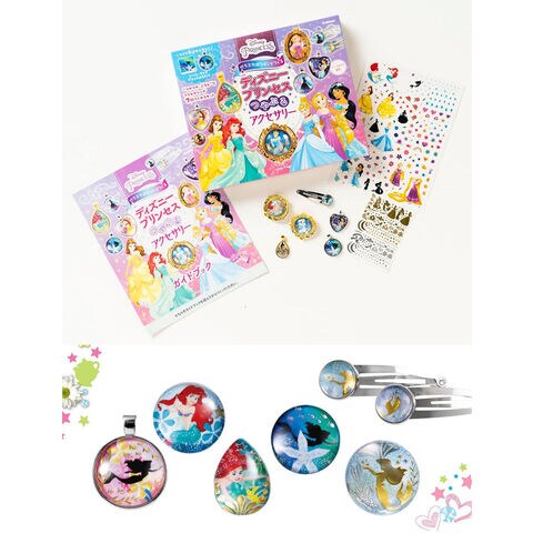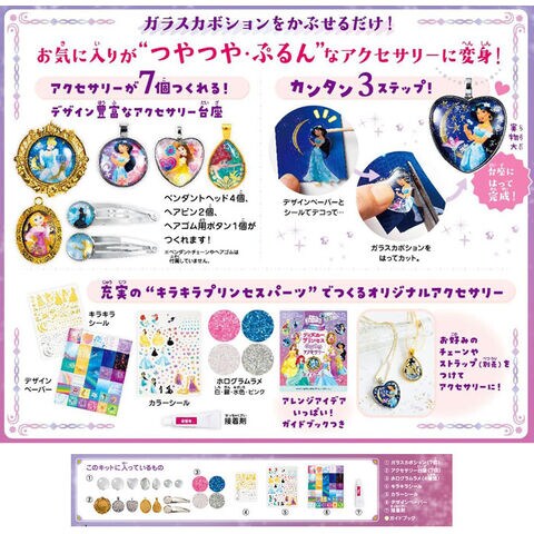 ガラスカボション7個、アクセサリー台座7個、ホログラムラメ(4種類)、カラーシール、キラキラシール、ディズニープリンセスデザインペーパー、接着剤、ガイドブック