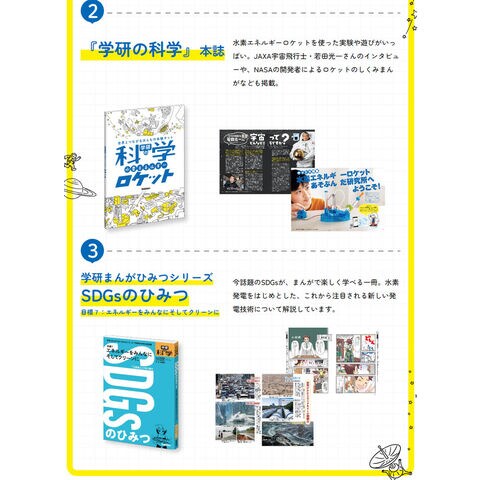 学研の科学 水素エネルギーロケット 世界とつながるほんもの体験キット 【工作キット 作成キット ガイドブック付属 知育玩具 自由研究 本 学研プラス】 『学研の科学』がついに復刊!!実験キット、本誌、学習まんが「ひみつシリーズ」に加えて、オンラインコミュニティである「学研の科学 あそぶんだ研究所」がセットになることで、子どもを夢中にさせる本物の科学体験をお届けします! 【商品の特徴】 ●ほんものの科学体験ができる実験キット! 創刊号は水素エネルギーロケット 『学研の科学』の主役は、学研の教材開発ノウハウを惜しみなく注ぎ込んだ科学キットです。 創刊号の水素エネルギーロケットは、電池を使わずに手回しで発電し、水からつくった水素を爆発させて飛ばすロケット。爆発は発射管の中だけで起こる安全設計なので、おうちで安心して飛ばせます。自分の手で試行錯誤してロケットを飛ばしたときの感動は、忘れられない体験となるはずです。 ●読者と編集部が直接つながるオンラインコミュニティ「学研の科学 あそぶんだ研究所」 「学研の科学 あそぶんだ研究所」は、読者と編集部が一緒になり、科学で遊びつくすコミュニティサイト。不思議に思ったことを編集部に質問したり、おうちからワークショップに参加したり、ここでしかできないオンライン体験が盛りだくさんです。 ●考える力を育む本誌。創刊号のテーマは「水素エネルギー」と「宇宙」 本誌では、キットの魅力を最大限に引き出す遊び方や実験を多数紹介!創刊号は、本物のロケットの飛ぶ原理や宇宙飛行士若田光一さんのインタビューなどを掲載。子どもの考える力を育てます。 ●学校や図書館で大人気の学習まんが『ひみつシリーズ』がまるごと1冊ついてくる! 『ひみつシリーズ』は、学校や図書館で小学生に大人気の学習まんが。1冊のまんがを通して、楽しく知識が身につきます。 【セット内容】 ・実験キット(組み立て) ・オンラインコミュニティ「学研の科学 あそぶんだ研究所」 ・本誌(74ページ) ・学習まんが ひみつシリーズ ■キットつき/冊子74ページ ■メーカー:学研ステイフル |