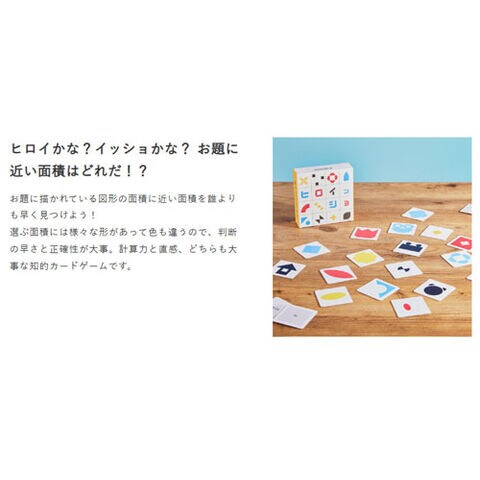ヒロイッショ GEO GAMES ジオゲームズ ボードゲーム カードゲーム 【面積 広いっしょ 一緒 日本語説明書付属 日本語箱 玩具 おもちゃ】 ヒロイかな?イッショかな?お題に一番近い面積はどれだ!? お題に描かれている図形の面積に近い面積を誰よりも早く見つけよう?選ぶ面積には様々な形があって色も違うので、判断の早さと正確性が大事なゲームです。「あの形とあの形がイッショなの!?」「こっちの方がヒロイんだ!」という発見や驚きがどんどん出てくるのも楽しめます。 さああなたは計算して正解を導き出すか直感で攻めるか、、、どう戦う!?どちらの要素も大事なこのゲームは知育にもおすすめです。 【入数】面積カード72枚、説明書 【ソト箱サイズ】W11×D11×H3.5cm 【素材】紙 【対象年齢】6歳以上~大人 【生産国】日本 ■メーカー:ジオジャパン |