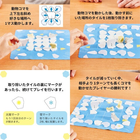 イキノコオリは、かわいい動物のコマを溶けていく氷の上で動かして遊ぶテーブルゲームです。