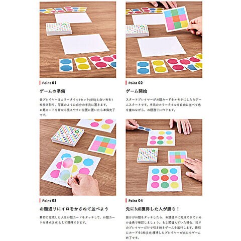 かさねイロ GEO GAMES ジオゲームズ ボードゲーム 【テーブルゲーム 対戦 パズル 重ね色 日本語説明書付属 日本語箱 玩具 おもちゃ】 手元にある6枚のタイルをお題どおりに誰よりも早く並べるだけのカンタンなルール。 しかしお題どおりに並べるには、タイルをかさねて色を作り出さないといけないのでアタマを使います。 遊びながら色についての理解が深まる、知育にもオススメのボードゲームです。 【入数】お題カード50枚、カラータイル24枚、布4枚、説明書(日・英・台) 【プレイ人数】2-4人 【プレイ時間】10-15分 【対象年齢】5歳以上~大人 【素材】紙、PVC、ポリエステル 【パッケージサイズ】11×11×3.5 (cm) 【企画・製造国】日本 ■メーカー:ジオジャパン |