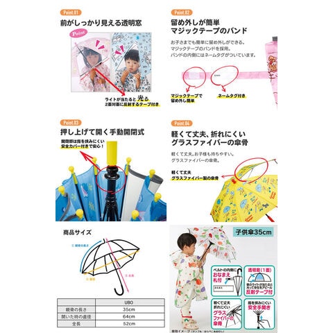 サンリオ マイメロディ 子供用傘 手開き 透明窓付 35cm UB0 【雨傘 長傘 かさ カサ キッズ こども 子ども 通園 通学 梅雨 雨の日】 キッチン用品で国内大手のスケーター株式会社の商品です! かわいいキャラクター柄の子ども用長傘。 傘骨は軽くて丈夫で折れにくいグラスファイバー。 透明窓付きで前がしっかり見えて安心。 クリア部分に車のライトを反射するテープ付き。 ベルトの内側には名前が書けるスペースがあります。 押し上げて開く手動開閉式です。 開閉部は指を挟みにくい安全カバー付きで安心! 【対応身長(約)】 85?95cm 【対象年齢(約)】 2?3.5歳 【商品サイズ(約)】 傘骨の長さ:35cm 開いた時の直径:64cm 全長:52cm 重さ:185g 【品質表示】 傘生地の組成:ポリエステル100% 透明部分:ポリエチレン 骨:グラスファイバー ※直射日光を避けて保管してください。 【子供 傘 35cm 手開き 透明窓付 サイズ 2歳 3歳 幼稚園 保育園 おしゃれ かわいい 子ども スケーター skater キッズ キャラクター 子供用 かさ カサ】 ■メーカー:スケーター(Skater) |