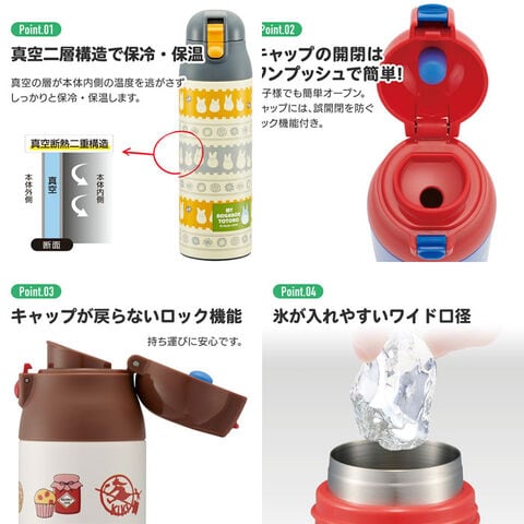 すみっコぐらし (うさぎのふしぎなおまじない) 水筒 超軽量 ロック付きワンプッシュステンマグボトル 500ml SDPC5 【すみっこぐらし 真空二層構造 保冷】 キッチン用品で国内大手のスケーター株式会社の商品です! ワンプッシュオープンで、飲みたい時に"サッ"と飲めるステンレスマグボトル☆ 真空二層構造なので、保温・保冷効果が長持ち♪ ※保温効力:63度以上(6時間) ※保冷効力:9度以下(6時間) 【ご注意】 熱い飲み物を入れた際は火傷の恐れがありますので 飲める程度まで冷ましてからお飲み下さい。 ・飲み口はソフトなプラスチックタイプ ・持ち運びに安心のロック機能付き ・飲む時に戻らないフタロック設計 ・氷が入れやすい広口タイプ ※電子レンジ・食洗機は使用不可です。 【商品サイズ(約)】 サイズ:直径67×高さ225mm 容量:500ml 重量:240g 【品質表示】 内びん、口がね:ステンレス鋼 胴部:ステンレス鋼(アクリル塗装) キャップ、フタ、飲み口、リング:ポリプロピレン パッキン:シリコーン 底板:エラストマー樹脂 【すみっこぐらし 真空二層構造 保冷 直飲み グッズ 雑貨 スケーター】 ■メーカー:スケーター(Skater) |