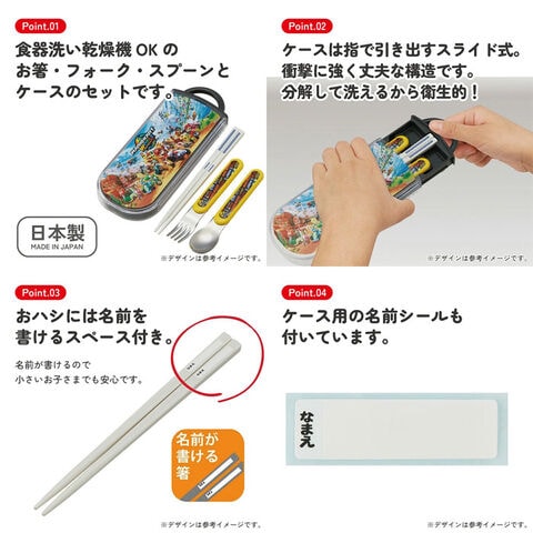 マリオカートワールド 食洗機対応 スライド式トリオセット (箸 フォーク スプーン ケース お名前シール付属) TACC2 【おはし 給食 お弁当】 キッチン用品で国内大手のスケーター株式会社の商品です! 食器洗い乾燥機OKのお箸・フォーク・スプーンとケースのセットです。 ケースは指で引き出すスライド式で、衝撃に強く丈夫な構造です。 ケースは分解して洗えるから衛生的。 おハシには名前を書けるスペース付き。 ケース用の名前シールも付いてます。 【商品サイズ(約)】 ケースサイズ:198×76×17mm 箸の長さ:16.5cm スプーン・フォーク:全長13cm 重さ:150g 【品質表示(耐熱温度)】 フタ・ハシ:AS樹脂(耐熱温度100度) 本体:ポリプロピレン(耐熱温度140度) スプーン・フォーク先:ステンレス鋼 スプーン・フォーク持ち手:ABS樹脂(耐熱温度100度) ●日本製 【スーパーマリオブラザーズ おはし 給食 お弁当 遠足 カトラリー グッズ 雑貨】 ■メーカー:スケーター(SKATER) |