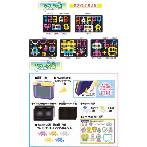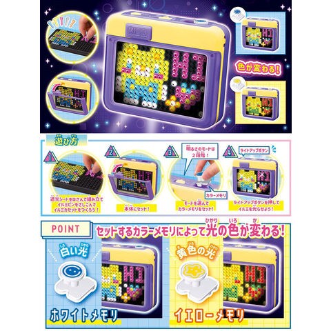 マイイルミ ポップカラー 【イルミネーション 作成キット メイキングトイ 玩具 おもちゃ インテリア アート メガハウス】 自分だけのイルミネーションが作れる新感覚ホビーが登場★ デザインガイドを参考にイルミピンをさしてイルミカセットをつくろう! 作ったイルミカセットは本体にセットしてライトアップ! 光り方は4種類から選べるよ。 付属のカラーメモリ(ドリームカラーにはピンクメモリとホワイトメモリが入っているよ)で光の色が変わる! イルミネーションを持ち歩こう♪ ■商品サイズ (W)123×(D)31×(H)101mm(本体サイズ) ■バッテリー LR44×3個(テスト用電池入り) ■メーカー:メガハウス |