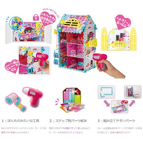 ドリーミーDIYトイ ねじハピ メガDIYセット 【工作 リメイク 手作り ハウスシェルフ 家 作成キット 知育玩具 キッズ 子供用 電動ドライバー JE-049 ピープル】 親子いっしょに楽しめる!本格ガールズDIYトイが登場! ねじの付け外しも、デコるのも、くるくる回る電動ドライバー(ねじハピドライバー)を使うから、6歳からカンタンDIYデビュー♪ 【2つの道具でハウスDIYをフル体験】 ●1、電動ドライバーと専用のねじを使ってハウスシェルフができます。 ●2、ペイントローラーを使って壁にデコレーション、自分だけのオリジナルの作品が作れます。 ・自分だけの設計図や、ステップアップで作れるダイアリーカードが載っている「DIYレシピBOOK」がはじめてのDIYをエスコート。 ・組み立てたあとはドライバーを使って動かすエレベーター収納や、ねじでロックをかける「ひみつのかぎ&屋根裏収納とびら」でドライバー遊びも充実。 【カンタン、楽しくDIYデビュー】 メガDIYセットのヒミツ ●1、ねじが落ちない「ホールド機構」 ねじを1度セットすると、ドライバーを下に向けても落ちません。ねじがしっかり留まるとドライバーから外れます。 ●2、開けて楽しい「パーツ別サプライBOX」 各パーツは手順ごとにBOX分けしているので、次は何を使うのか、開けるまでのお楽しみ。 ●3、組み立てやすい「フレーム&ハウス板パーツ」 フレームパーツを組み合わせて、ハウス板をのせてねじ留め。立体に組み立てていくよ。 ■電池:単四電池2本使用(別売) ■対象年齢:6才以上 ■メーカー:ピープル |