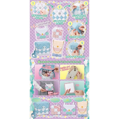 パチェリエ トキメキミルキー 【PCR-054 バニティバッグ コンパクトミラー スマホケース 移動ポケット 作成キット メイキングトイ 工作 手芸 手作り】 糸を使わずにカラフルなピースをつなげて、ファッション小物が作れちゃう! パチェリエからバニティバッグや移動ポケットなど4つが作れる豪華セットが登場! くすみ感のあるミルキーカラーのピースが盛りだくさん!おしゃれにぴったりのセットです。 回してロックできる開閉用のパーツや服に挟んで使えるクリップなど、便利なパーツが新登場して、もっと実用的になりました。 【パチェリエおすすめポイント】 ジョイントをつなげるだけで本格的なバッグが簡単に作れちゃう!! ピースを組みかえると、デザインが変わる!オリジナルのバッグをつくっちゃお!! かわいいチャームやデコパーツがいっぱい♪ 【セット内容】 ピース104個、ジョイント142個、鏡シート1枚、バンドクリップ2個、チェーンリング2個、チェーンリッグネジ2個、指キャップ1個、ハートピック1個、ハンドルチェーン1本、ショルダーストラップ1本、ソーイング針1本、リボン1本、デザインシート1枚、取扱説明書1枚 ■対象年齢 :6才以上 ■メーカー:ビバリー |