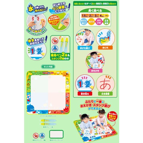 スイスイおえかき カラフルシート ペン2本&スタンプセット おえかき・いろ・ことば・ぬりえ・すうじ 【マット お絵かき玩具 知育玩具】 お水のペンで描くから汚れない!シートに描いた絵は乾けば消えるので何度でも繰り返し遊べます。 大きなシートでのびのび描けて、ぬりえやスタンプ遊びができます。 カラフルな4色のシートで色・言葉・数字を覚えられます。 水道水を入れる専用ペンは、名古屋市立大学と共同研究し、人間工学に基づいた形状になっています。 正しいペンの持ち方が身に付く形状なので、はじめてのペン練習にぴったり。 シートは折りたためるのでお片付けも簡単です。 【セット内容】 スイスイおえかきシート(約78cm×78cm)、専用ペン2本、専用スタンプ2種、専用スタンプパッド ■対象年齢 1.5歳以上 ■メーカー:パイロットコーポレーション |