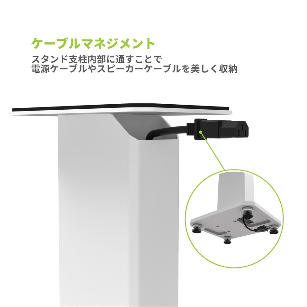 電源ケーブルやスピーカーケーブルをスタンドの支柱内部に通すことで、すっきりとした外観を保つことができます。