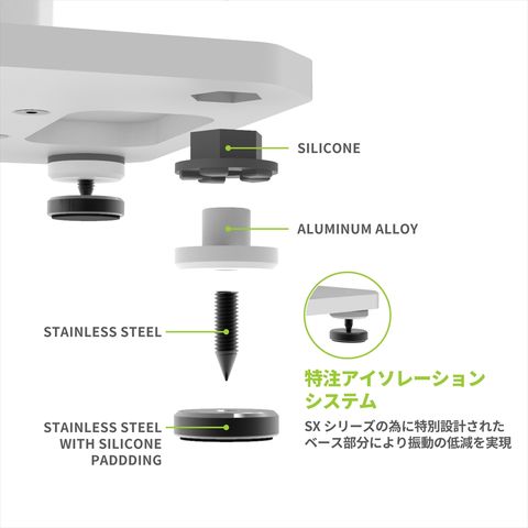 SXシリーズの為に設計されたアイソレーション・システムにより、スピーカーの共振を低減。頑丈なベースプレートが重心を下げスタンドの転倒を防ぎます。