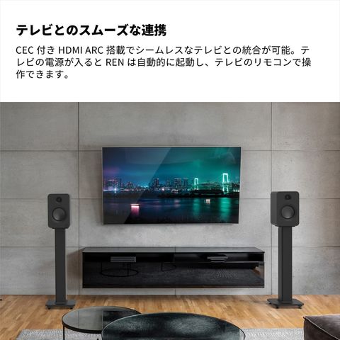 CEC付きHDMI ARC搭載でシームレスなテレビとの統合が可能。テレビの電源が入るとRENは自動的に起動し、テレビのリモコンで操作できます。