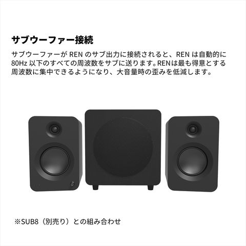 サブウーファーがRENのサブ出力に接続されると、RENは自動的に80Hz以下のすべての周波数をサブに送ります。RENは最も得意とする周波数に集中できるようになり、大音量時の歪みを低減します。