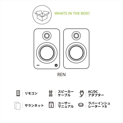 ● 付属品:ラバーインシュレーター x 8、電源ケーブル、4ピンスピーカーケーブル 、ユーザーマニュアル、専用リモコン、専用グリル