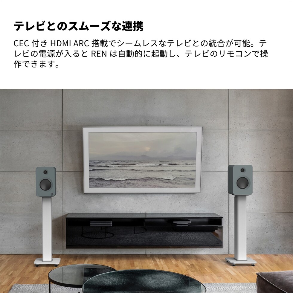 CEC付きHDMI ARC搭載でシームレスなテレビとの統合が可能。テレビの電源が入るとRENは自動的に起動し、テレビのリモコンで操作できます。