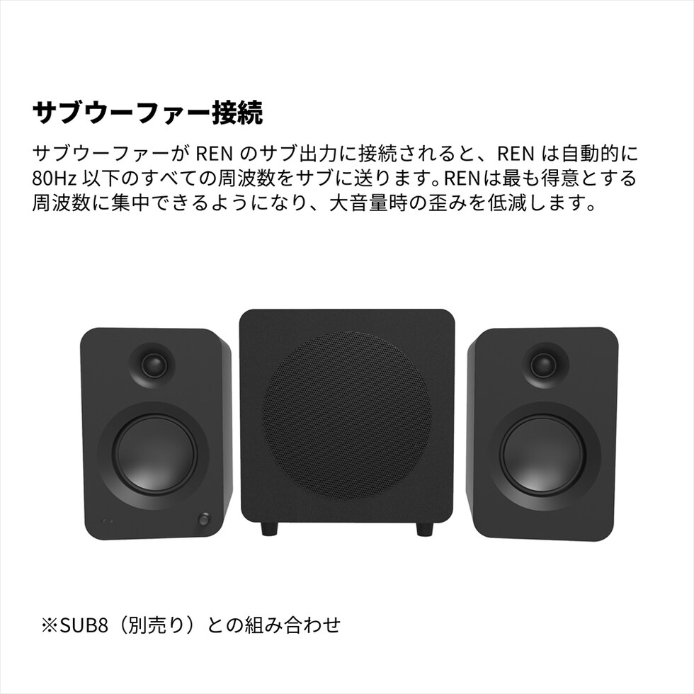 サブウーファーがRENのサブ出力に接続されると、RENは自動的に80Hz以下のすべての周波数をサブに送ります。RENは最も得意とする周波数に集中できるようになり、大音量時の歪みを低減します。